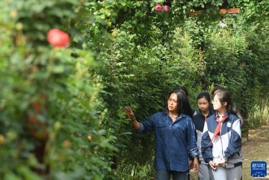 4月20日,玫瑰莊園的創(chuàng)始人季梅(左一)向前來研學(xué)的中學(xué)生介紹玫瑰品種。