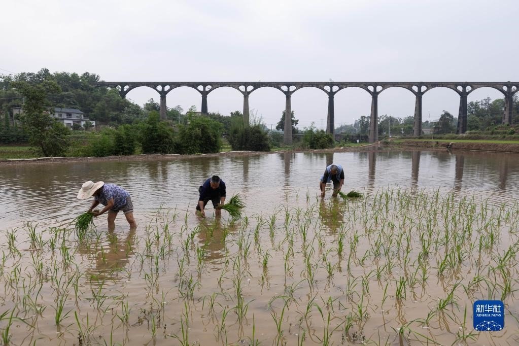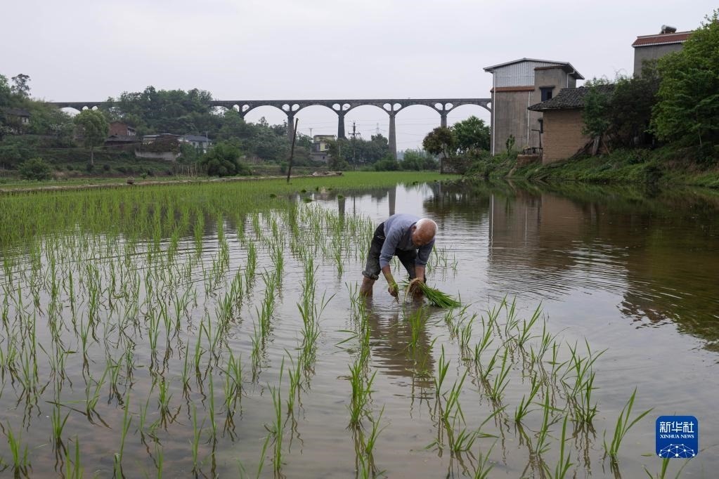 4月25日,在瀘縣奇峰鎮(zhèn)寶豐村,村民在寶藏渡槽附近的水田里插秧。