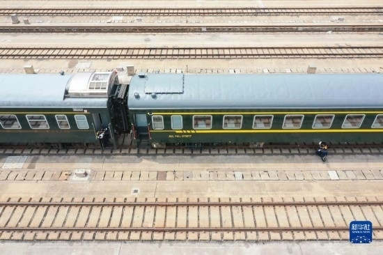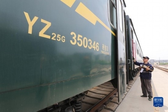 4月28日,中國(guó)鐵路上海局集團(tuán)有限公司徐州站的鐵路連結(jié)員在對(duì)臨時(shí)旅客列車進(jìn)行拉風(fēng)作業(yè)(無(wú)人機(jī)照片)。
