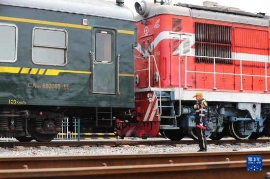 4月28日,中國(guó)鐵路上海局集團(tuán)有限公司徐州站的鐵路連結(jié)員在進(jìn)行單機(jī)連掛車輛作業(yè)。