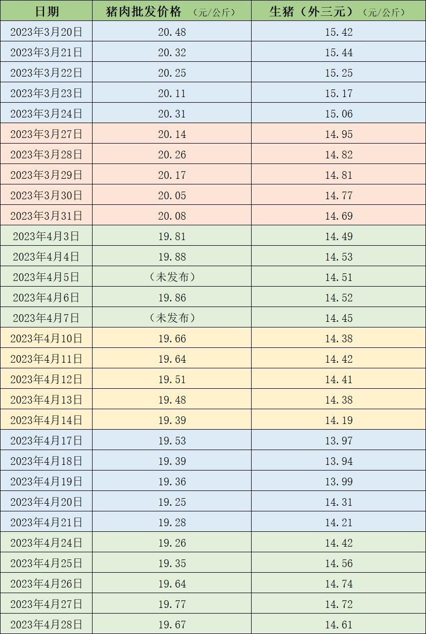 據(jù)農(nóng)業(yè)農(nóng)村部監(jiān)測,4月28日,全國農(nóng)產(chǎn)品批發(fā)市場豬肉平均價格為19.67元/公斤,與上周五(4月21日)的19.28元/公斤相比,上漲2%。本周的平均價格為19.54元/公斤,與上周19.36元/公斤相比,上漲0.9%。