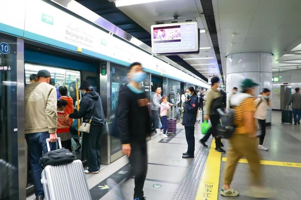 “大家進(jìn)站時要小心腳下的行李箱。”3日14時,隨著大量鐵路旅客抵達(dá)北京南站,地鐵4號線北京南站也開始變得忙碌。站廳內(nèi),工作人員在自動售票機(jī)、閘機(jī)前引導(dǎo)旅客快速購票進(jìn)站;站臺上,軌道列車準(zhǔn)時抵達(dá),乘客快速流動疏散。