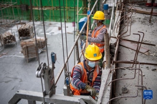 5月3日,工人在湖南長(zhǎng)沙智谷項(xiàng)目建設(shè)工地為一棟高層建筑安裝幕墻。