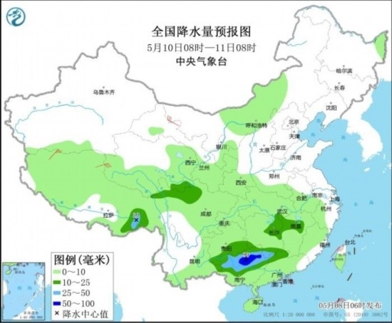 全國降水量預(yù)報(bào)圖(5月10日08時-11日08時)
