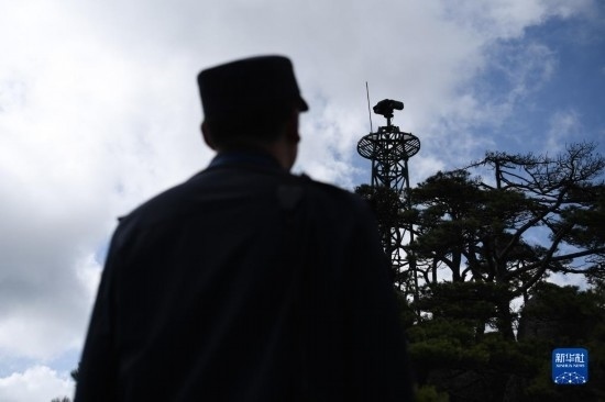 這是5月8日拍攝的黃山風景區(qū)平天矼瞭望哨(無人機照片)。