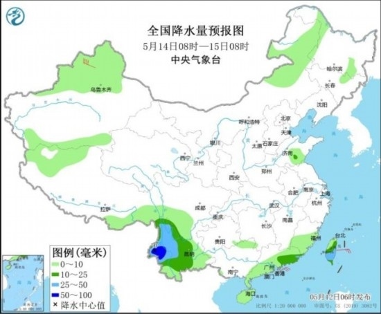 5月14日08時至15日08時,西南地區(qū)南部、廣東東南部、臺灣島大部等地部分地區(qū)有中到大雨,其中,云南西南部等地部分地區(qū)有暴雨(50~70毫米)。新疆北疆北部部分地區(qū)有6~7級風。