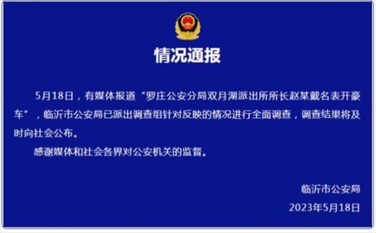 ·網(wǎng)傳山東省臨沂市羅莊區(qū)雙月湖派出所所長趙某戴名表、開豪車一事引發(fā)關(guān)注,臨沂市公安局發(fā)布情況通報。