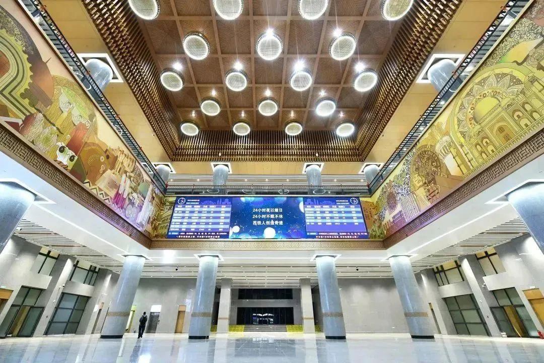 站房?jī)?nèi),壁畫《絲路百景》展現(xiàn)了古今絲綢之路的文化延續(xù),北站房噴繪長(zhǎng)卷壁畫《晉陜黃河八百里》,讓旅客一覽晉陜大美景觀。