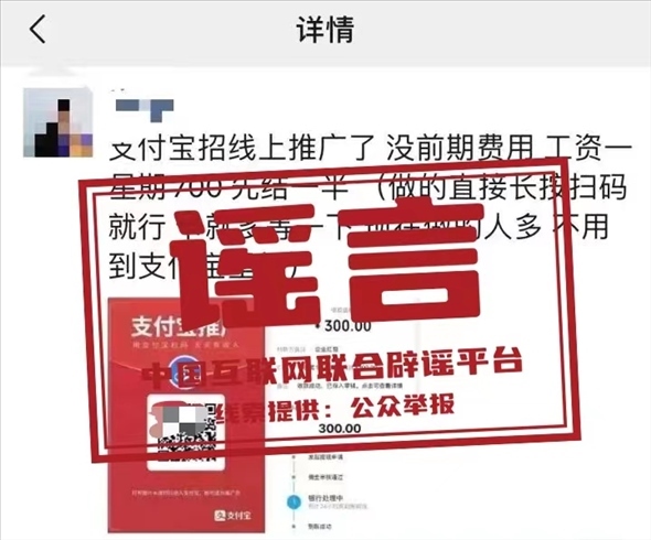 真相:近日,有網(wǎng)民向支付寶開放平臺反饋,看到有打著“螞蟻推廣”或“支付寶推廣”等旗號,聲稱“出租朋友圈可以賺取100/天”的推廣任務(wù)。對此,支付寶辟謠稱,此類活動(dòng)均為詐騙,請勿輕信。