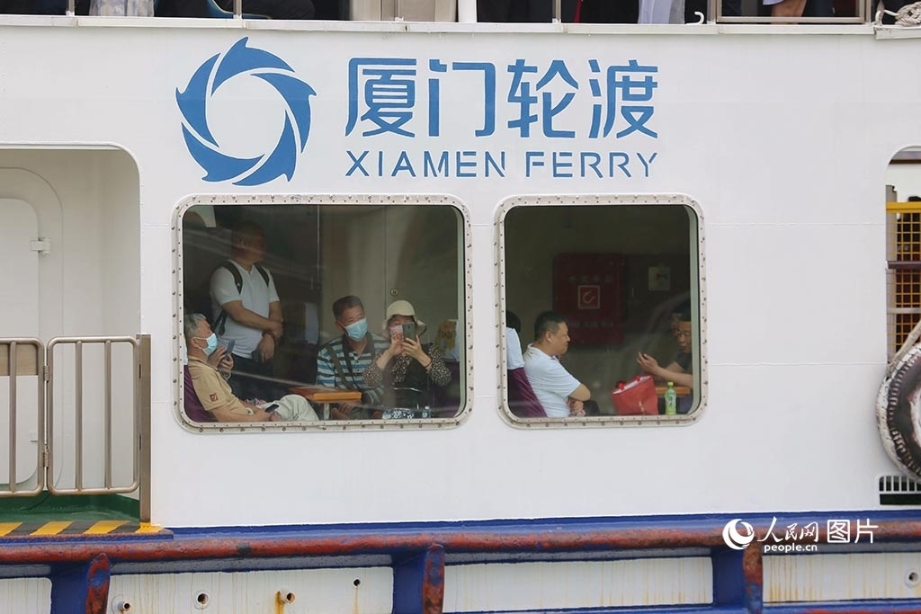5月14日,廈門輪渡船停靠鼓浪嶼內(nèi)厝澳碼頭,船艙里的游客迫不及待地拿起手機拍照。人民網(wǎng)記者 陳博攝