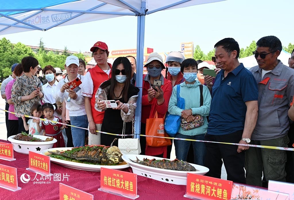 5月17日,“中國旅游日”主題周活動期間,河南省義馬市舉辦“櫻紅五月”美食節(jié),集中展示當?shù)氐奶厣朗场⒚麅?yōu)特產(chǎn),為了讓游客有更好的體驗,當?shù)?2家飯店還進行了精彩紛呈的廚藝大比拼?;顒蝇F(xiàn)場,游客在圍觀經(jīng)典豫菜“紅燒黃河大鯉魚”。人民網(wǎng)記者 王玉興攝
