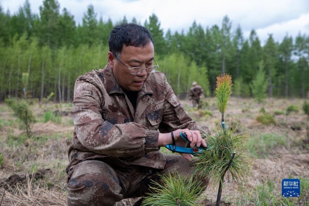 5月21日,在伊春森工集團(tuán)紅星林業(yè)局公司五星河林場分公司紅松兼果林基地,工作人員在養(yǎng)護(hù)紅松嫁接苗。
