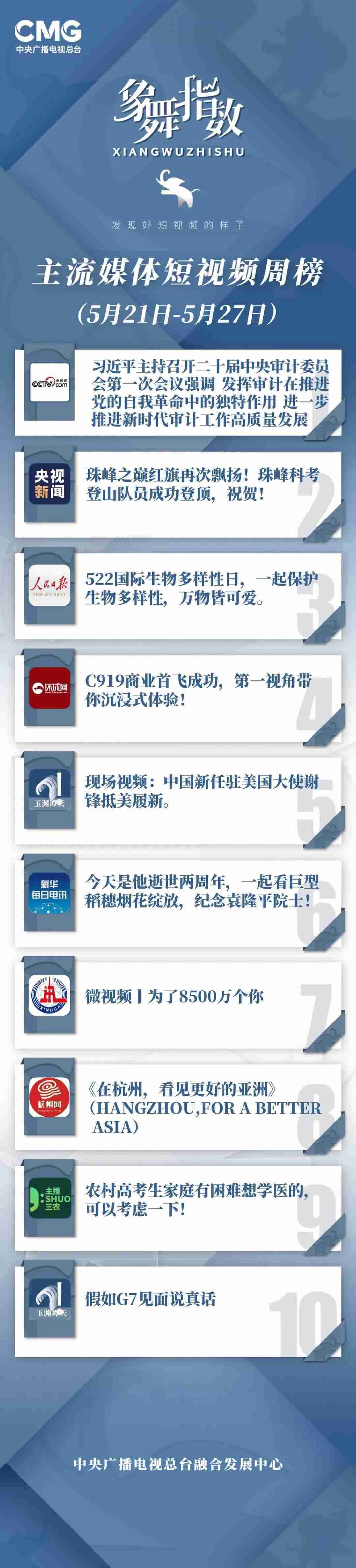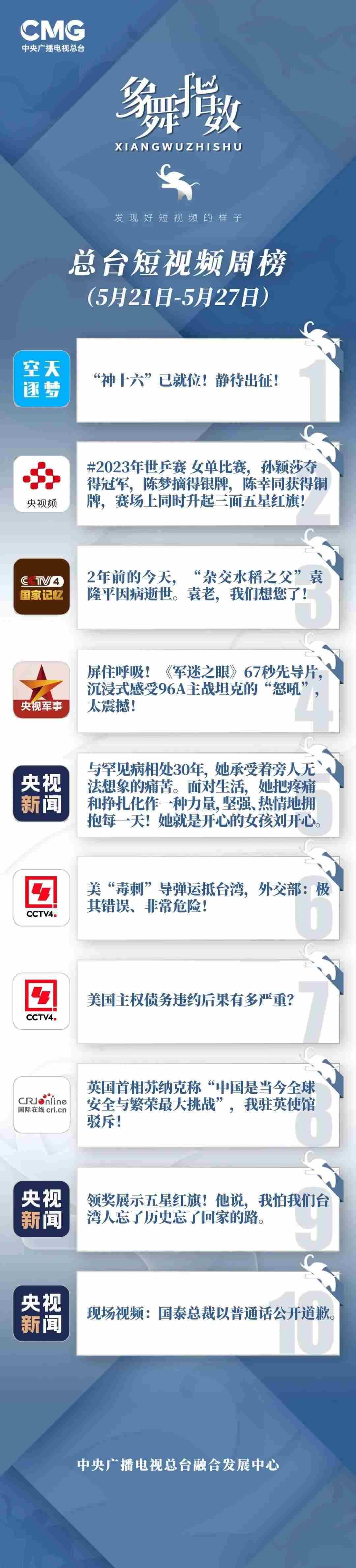 中央廣播電視總臺(tái)“象舞指數(shù)”評議品牌,推出主流媒體短視頻周榜、總臺(tái)短視頻周榜。在2023年5月21日—5月27日,這些內(nèi)容引發(fā)大眾關(guān)注: