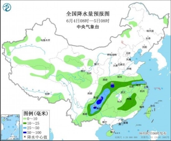 2日至4日,青海東部、甘肅南部、陜西南部、四川東部、重慶、貴州、湖北西部及河南南部、安徽北部等地部分地區(qū)將有中到大雨,局地有暴雨或大暴雨,并伴有雷暴大風或短時強降水等強對流天氣。其中,6月2日08時至3日08時,黑龍江東南部、貴州北部等地的局地將有雷暴大風或冰雹天氣;黑龍江東南部、湖北西部、湖南東南部、江西南部、四川東部、重慶、貴州中西部和東北部、云南南部、廣西北部、廣東東部和北部等地的部分地區(qū)將有短時強降水天氣,小時雨量20~40毫米,局地可達50毫米以上。