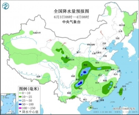 全國降水量預(yù)報圖(6月2日08時-3日08時)