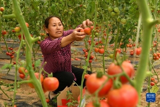 6月4日,農民在獻縣河城街鎮(zhèn)梅莊洼農場大棚內采摘西紅柿。
