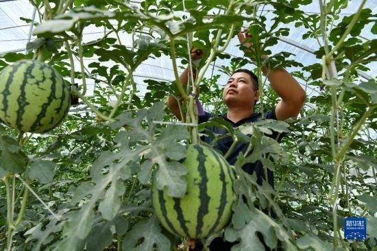 6月4日,農民在獻縣河城街鎮(zhèn)梅莊洼農場大棚內管理種植的西瓜。