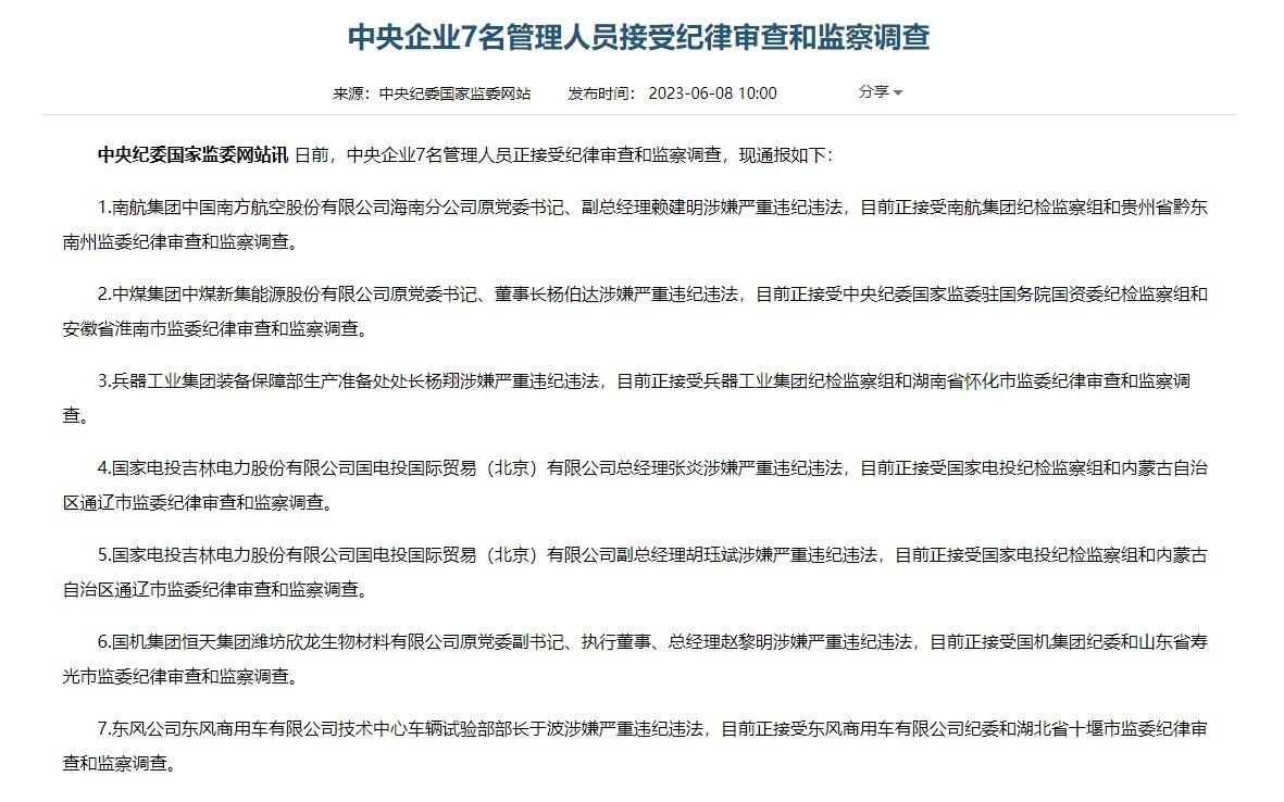 ·中央企業(yè)7名管理人員接受紀律審查和監(jiān)察調(diào)查。