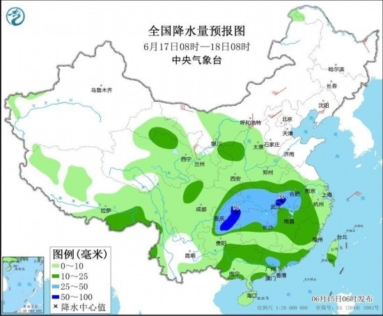 全國降水量預(yù)報(bào)圖(6月17日08時(shí)-18日08時(shí))圖自中央氣象臺(tái)網(wǎng)站