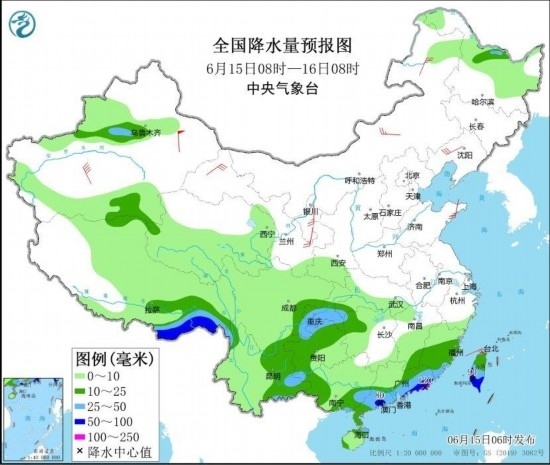 6月15日08時(shí)至16日08時(shí),西藏東南部、四川東南部、云南東部和西北部、重慶中南部、湖北西南部、湖南西北部、貴州北部和西部、廣西南部、廣東南部和東部、福建中南部、海南島東北部、臺(tái)灣島大部以及新疆沿天山地區(qū)、黑龍江北部等地部分地區(qū)有中到大雨,其中,西藏東南部、廣東南部沿海、臺(tái)灣島南部等地局地有暴雨或大暴雨(100~120毫米)。新疆南疆盆地、甘肅西部、寧夏、內(nèi)蒙古中部和東北部、遼寧中南部、山東半島等地部分地區(qū)有5~6級(jí)風(fēng)。