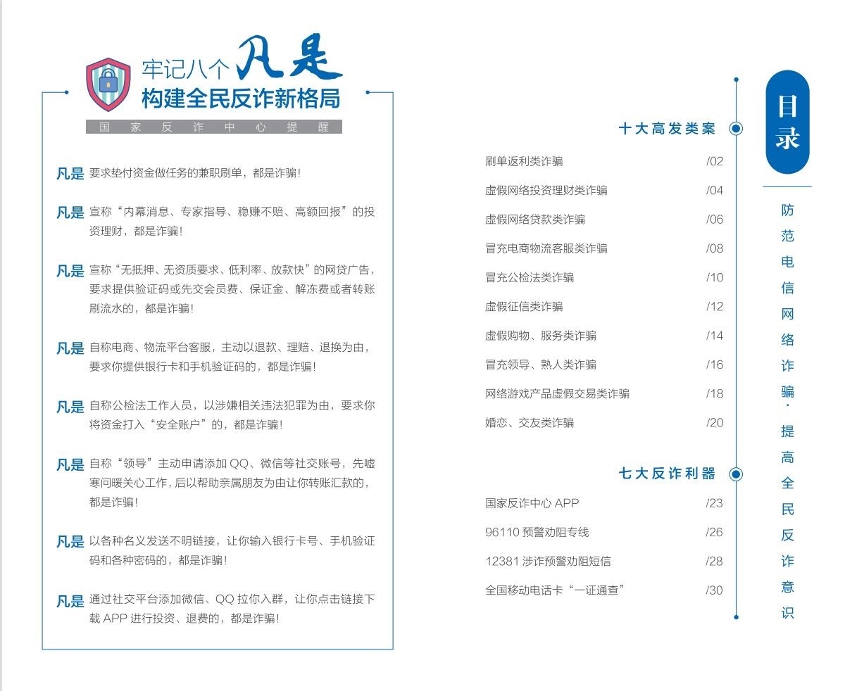 人民網(wǎng)北京6月16日電 (記者郝萍、梁秋坪)按照中央宣傳部、公安部聯(lián)合部署開展的“全民反詐在行動(dòng)”集中宣傳月活動(dòng)有關(guān)要求,國(guó)家反詐中心編寫制作并最新推出《2023版防范電信網(wǎng)絡(luò)詐騙宣傳手冊(cè)》(以下簡(jiǎn)稱《手冊(cè)》),詳細(xì)梳理10類高發(fā)電信網(wǎng)絡(luò)詐騙案件特點(diǎn)和詐騙手法,深入介紹7大反詐利器的主要功能和使用方法,進(jìn)一步擴(kuò)大反詐宣傳覆蓋面,提升廣大群眾識(shí)騙防騙意識(shí)和能力。