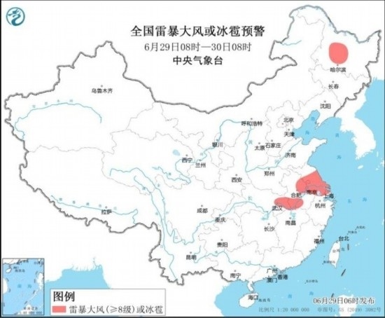 中央氣象臺6月29日06時繼續(xù)發(fā)布暴雨藍色預(yù)警和強對流天氣黃色預(yù)警:預(yù)計,6月29日08時至30日08時,黃淮南部、江淮、江漢中南部、江南北部、重慶東部以及黑龍江北部、內(nèi)蒙古東北部等地部分地區(qū)有大到暴雨,其中,湖北東部等地局地有大暴雨(100~150毫米)。上述部分地區(qū)伴有短時強降水(最大小時降雨量30~50毫米,局地可超過70毫米),黑龍江中部、安徽中南部、江蘇中南部、上海西北部、湖北東部等地的部分地區(qū)將有8~10級雷暴大風(fēng)或冰雹天氣,局地風(fēng)力11級,江蘇中南部局地可能伴有龍卷(見圖1和圖2)。強對流的主要影響時段為今天午后至夜間。