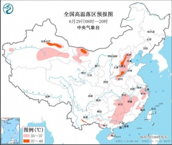 中央氣象臺6月29日06時繼續(xù)發(fā)布高溫黃色預(yù)警:預(yù)計6月29日白天,北京、天津、河北中南部、河南北部、山東西部、湖南東部、江西、浙江中北部、福建北部、廣西西部和東北部、廣東西北部以及內(nèi)蒙古西北部、新疆東部、甘肅河西等地的部分地區(qū)有35~37℃高溫天氣,其中,河北中南部、河南北部、新疆吐魯番盆地等地局地最高氣溫可達38~39℃(見圖3)。