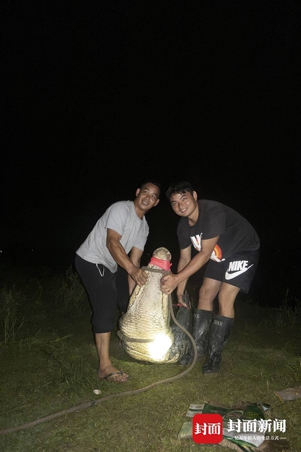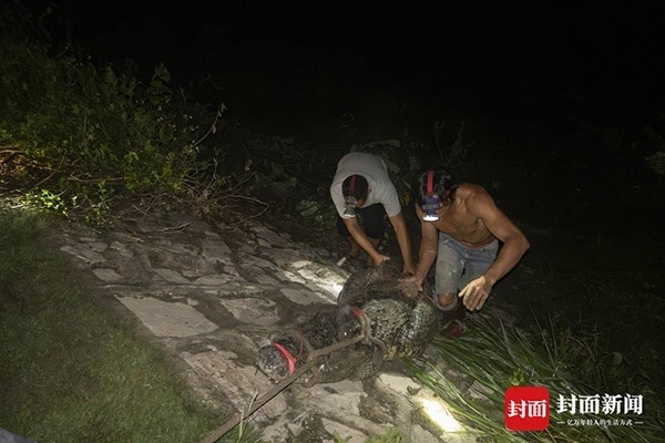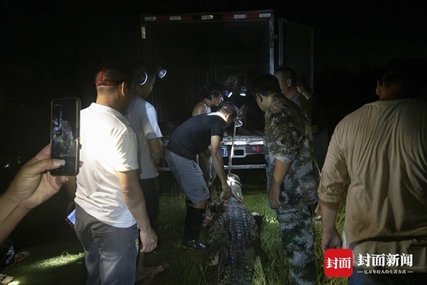9月16日深夜,封面新聞?dòng)浾邚膹V東茂名茂南區(qū)“出逃”暹羅鱷抓捕現(xiàn)場獲悉,當(dāng)夜有3條暹羅鱷被專業(yè)人員從養(yǎng)殖場外的水域中抓捕上岸。9月11日,茂南區(qū)一鱷魚養(yǎng)殖場因洪水沖塌圍墻造成部分鱷魚“出逃”,經(jīng)過連續(xù)6天的搜尋,截至16日24時(shí),養(yǎng)殖場中原養(yǎng)殖的71條暹羅鱷已有69條被抓獲,僅剩2條仍在搜尋。