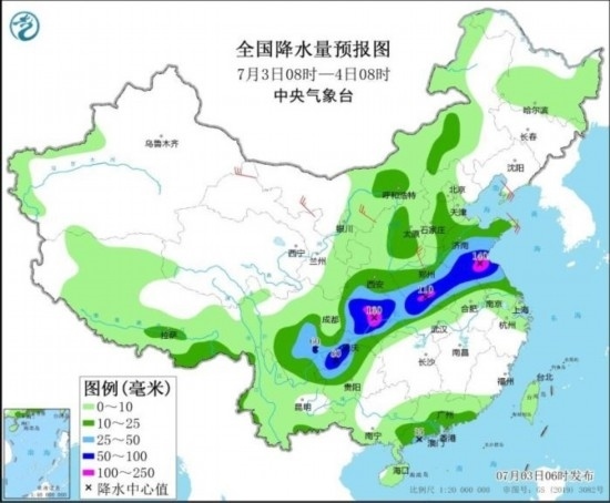 中央氣象臺7月3日06時繼續(xù)發(fā)布暴雨藍(lán)色預(yù)警:預(yù)計(jì),7月3日08時至4日08時,山東中南部、江蘇北部、安徽北部、河南東部和南部、湖北北部和西部、陜西南部、重慶、四川東部、貴州西北部、云南東北部以及廣東西南部沿海等地部分地區(qū)有大到暴雨,其中,山東南部、江蘇北部、河南南部、重慶北部、四川東北部等地局地有大暴雨(100~160毫米)。上述部分地區(qū)伴有短時強(qiáng)降水(最大小時降雨量30~50毫米,局地可超過60毫米),局地有雷暴大風(fēng)等強(qiáng)對流天氣。