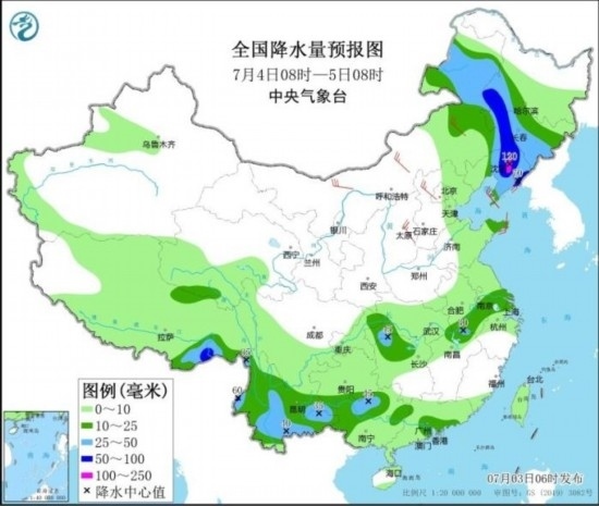 7月4日08時至5日08時,內(nèi)蒙古東部、黑龍江南部、吉林、遼寧以及蘇皖南部、湖北西南部、湖南北部、廣東南部、廣西北部和西部、云南大部、西藏東南部等地部分地區(qū)有中到大雨,其中,內(nèi)蒙古東北部、黑龍江西南部、吉林中西部、遼寧中東部、西藏東南部等地部分地區(qū)有暴雨或大暴雨(100~120毫米)。內(nèi)蒙古、華北北部和西部、黃淮東部、東北地區(qū)南部等地部分地區(qū)有4~6級風(fēng)。
