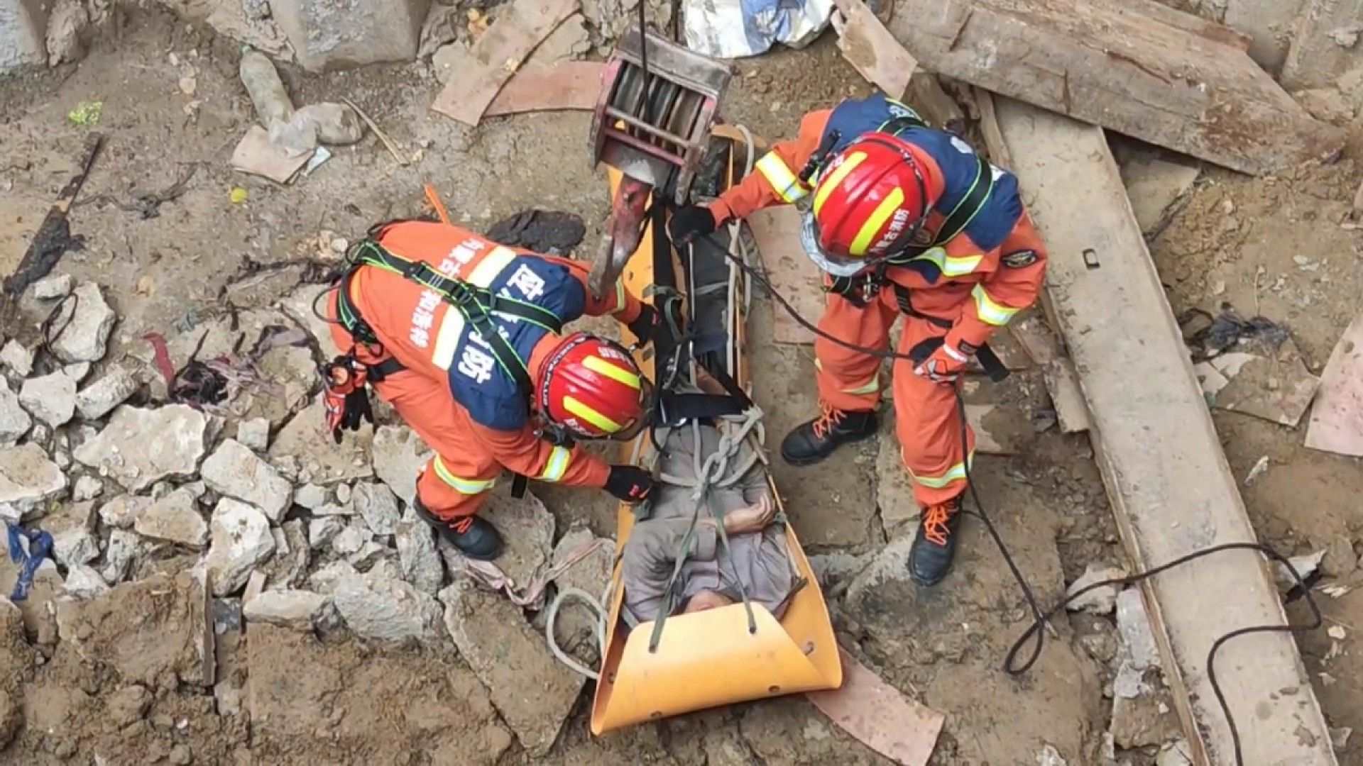 現(xiàn)場(chǎng)指揮員立即組織救援人員穿戴好防護(hù)裝備,攜帶多功能擔(dān)架并利用附近施工吊車(chē)下降到被困人員位置,針對(duì)被困人員受傷部位做好保護(hù)措施后,將被困男子轉(zhuǎn)移至擔(dān)架上。