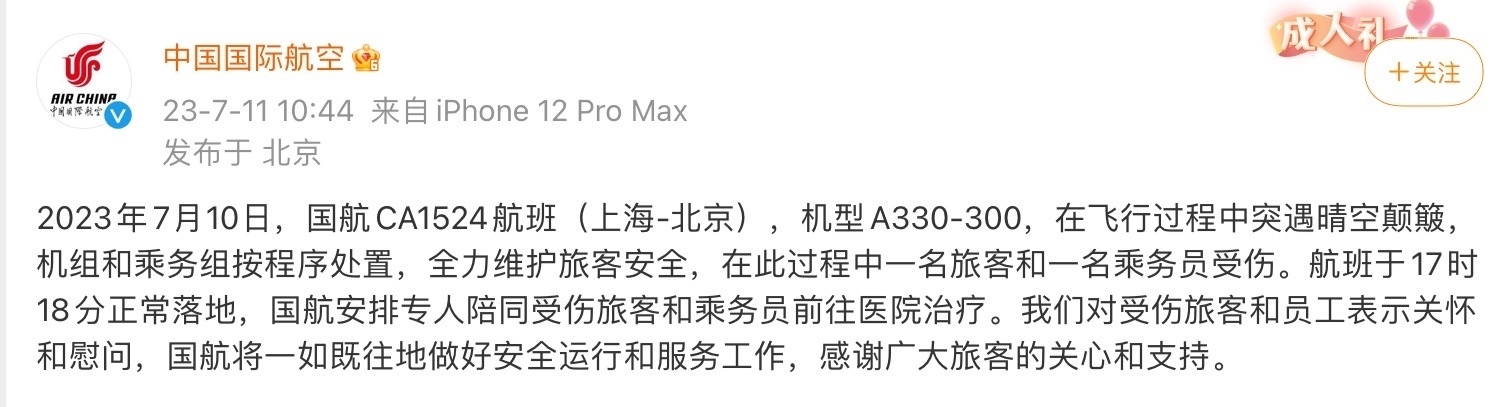 7月11日,中國(guó)國(guó)際航空在其官方微博發(fā)布通報(bào):2023年7月10日,國(guó)航CA1524航班(上海-北京),機(jī)型A330-300,在飛行過(guò)程中突遇晴空顛簸,機(jī)組和乘務(wù)組按程序處置,全力維護(hù)旅客安全,在此過(guò)程中一名旅客和一名乘務(wù)員受傷。航班于17時(shí)18分正常落地,國(guó)航安排專人陪同受傷旅客和乘務(wù)員前往醫(yī)院治療。