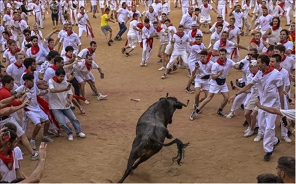 當(dāng)?shù)貢r(shí)間2023年7月10日,西班牙潘普洛納,圣費(fèi)爾明節(jié)期間,狂歡者站在公牛周圍,公牛進(jìn)入斗牛場(chǎng)。