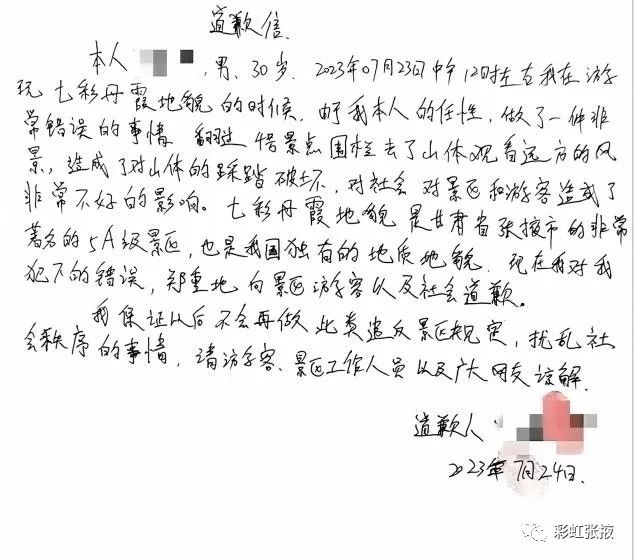 同時,張掖丹霞大景區(qū)管理委員會(張掖國家地質公園管理局)微信公眾號還發(fā)布了這名游客的道歉信。該游客稱“由于本人的任性,做了一件非常錯誤的事情,翻過4號景點圍欄去了山體觀看遠方的風景,造成了對山體的踩踏破壞,對社會、對景區(qū)和游客造成了非常不好的影響?!?/p>