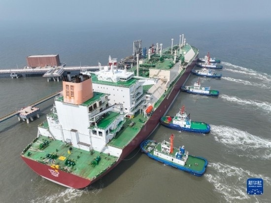 一艘LNG運(yùn)輸船靠泊在唐山港曹妃甸港區(qū)(2023年6月18日攝,無人機(jī)照片)。新華社發(fā)(趙亮攝)