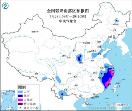 預計,7月28日08時至29日08時,江蘇南部、安徽南部、浙江、福建、江西東部以及甘肅東部、陜西中部、云南南部、河南北部、山東西北部和東南部等地的部分地區(qū)有大到暴雨,其中,浙江北部和東部、福建東部等地的部分地區(qū)有大暴雨,局地特大暴雨(250~280毫米)。上述部分地區(qū)伴有短時強降水(最大小時降雨量30~60毫米,局地可超過80毫米),局地有雷暴大風等強對流天氣。中央氣象臺7月28日06時繼續(xù)發(fā)布暴雨橙色預警。