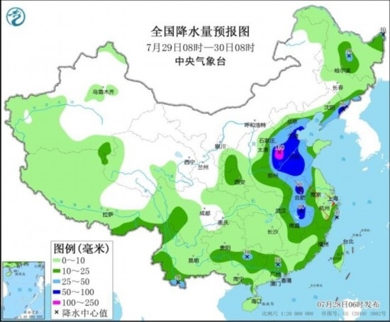 7月29日08時至30日08時,東北地區(qū)東部、甘肅東部、陜西中部、華北中東部、黃淮大部、江淮大部、江南中東部、湖北東部、華南北部等地部分地區(qū)有中到大雨,其中,遼寧東部、河北東部和南部、天津、山東中西部、河南北部和東部、安徽北部和西南部、江西北部等地部分地區(qū)有暴雨或大暴雨(100~150毫米)。安徽中部、江蘇南部、浙江北部等地部分地區(qū)有5~7級風,局地風力可達8~9級。