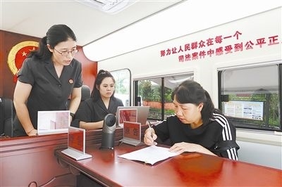 圖③:干警在“車載便民法庭”對調解協(xié)議現(xiàn)場進行司法確認。