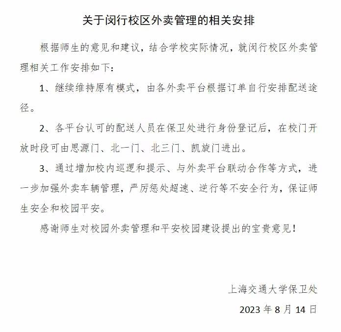 疫情期間,上海交大入校規(guī)定根據(jù)疫情形勢有所變動。2023年2月10日,“平安交大”微信公眾號發(fā)文稱,學生親友可入校,外賣暫不入校;同年3月3日,上述公眾號發(fā)文表示,即日起,正規(guī)經(jīng)營的外賣員可入閔行校區(qū)送餐,所有入校外賣員均需著裝正規(guī)、限速行駛,嚴禁無證外賣員入校,“出于安全和統(tǒng)一管理的考慮,目前只允許美團和餓了么指定的專業(yè)校園配送團隊外賣員入校配送外賣,對于其他的外賣員暫未開放,本次校園外賣準入未向任何外賣員或配送團隊收取押金或其他費用。”