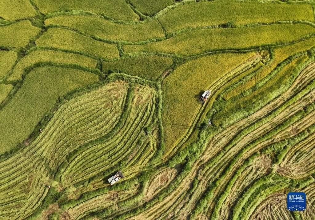近日,四川東部廣安市近200萬畝水稻進入成熟收獲期,農民在田間忙碌,收獲水稻。