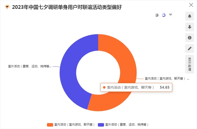 “單身經(jīng)濟(jì)與浪漫經(jīng)濟(jì)并不沖突?!睆堃愀嬖V記者,今年單身人士參加七夕節(jié)交友聯(lián)誼活動(dòng)意愿強(qiáng)烈,“有53.77%的表示會(huì)參加。在聯(lián)誼活動(dòng)的選擇上,54.65%的人會(huì)選擇劇本殺、密室逃脫、桌游等室內(nèi)活動(dòng)?!?/p>