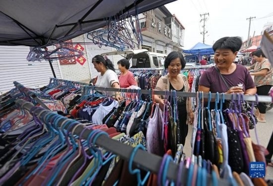 8月25日,在天津市靜海區(qū)臺(tái)頭鎮(zhèn),前來趕集的村民在大集上挑選商品。