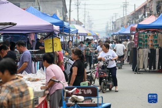 8月25日,在天津市靜海區(qū)臺(tái)頭鎮(zhèn),前來趕集的村民在大集上購買商品。