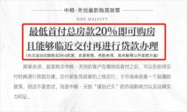 8月26日,紅星資本局向“中糧天悅”售樓部求證此時(shí),一名置業(yè)顧問回復(fù)稱,最近確實(shí)推出了“先交付后還貸”的購(gòu)房政策,購(gòu)房者可以先交首付,簽訂購(gòu)房合同,交房前再辦理貸款即可。