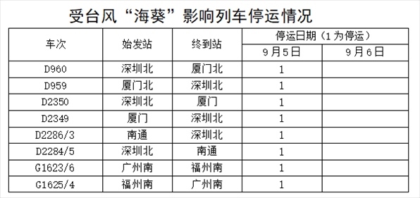 據(jù)中央氣象臺消息,今年第11號臺風“??庇诮裉欤?月5日)早晨5點20分前后在福建省東山縣沿海登陸,福建東部部分地區(qū)將有大暴雨,并伴有短時強降水,局地有雷暴大風等強對流天氣。為防范臺風影響,保障鐵路運輸安全,中國鐵路南昌局集團有限公司繼續(xù)調整部分旅客列車運行方案,停運管內途經(jīng)杭深線福州南至詔安,龍漳線龍巖至漳州,昌福線三明北至福州等區(qū)段旅客列車。同時,加開15趟旅客列車,方便旅客出行。