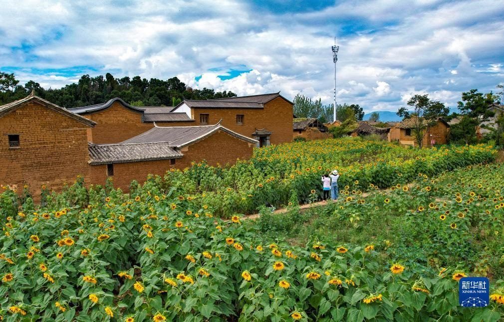 10月3日,游客在位于云南省昆明市滇池邊的臥龍古漁村內(nèi)游覽拍照(無人機照片)。