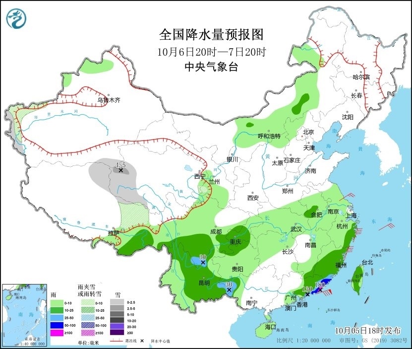 10月5日20時(shí)至6日20時(shí),西藏東北部、青海中南部和東北部、甘肅西北部等地部分地區(qū)有小到中雪或雨夾雪,青海西北部局地有大雪;西藏東南部、陜西南部、四川盆地東部、重慶、貴州西部、云南東北部、湖北西部、廣東東部沿海、福建南部及臺(tái)灣島南部等地部分地區(qū)有中到大雨,其中,西藏東南部、臺(tái)灣島南部等地部分地區(qū)有暴雨(50~75毫米)。西藏西部、四川盆地中部等地有5~6級風(fēng)、陣風(fēng)7級,浙江沿海、福建沿海、廣東東部沿海、臺(tái)灣島西北部沿海等地有6~8級風(fēng)、陣風(fēng)9級(見圖1)。