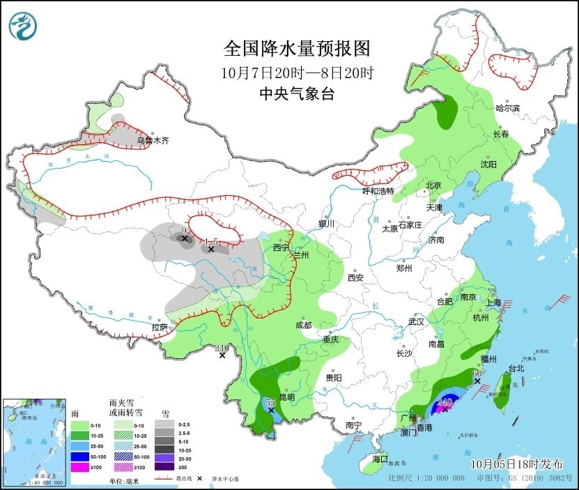 10月7日20時(shí)至8日20時(shí),青海中南部、西藏東北部、新疆西部等地部分地區(qū)有小雪或雨夾雪,青海中部局地有中到大雪;四川南部、云南中部、浙江南部、福建南部、廣東東部、臺(tái)灣島等地部分地區(qū)有中到大雨,其中廣東東部、福建南部、云南南部等地部分地區(qū)有暴雨,廣東東部沿海地區(qū)局地有大暴雨(100~240毫米)。浙江、福建和廣東沿海等地有4~6級風(fēng)、陣風(fēng)7級;東海西南部及中部海域、臺(tái)灣海峽、南海東北部偏北海域有6~7級風(fēng)、陣風(fēng)8~9級(見圖3)。