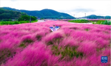 國慶期間,在浙江省寧波市北侖區(qū)梅山街道梅山灣水道沿線,游客在粉黛亂子草中游玩。