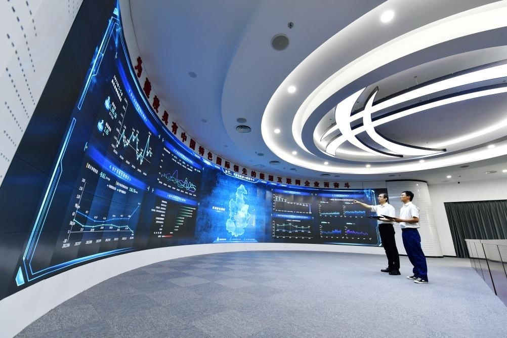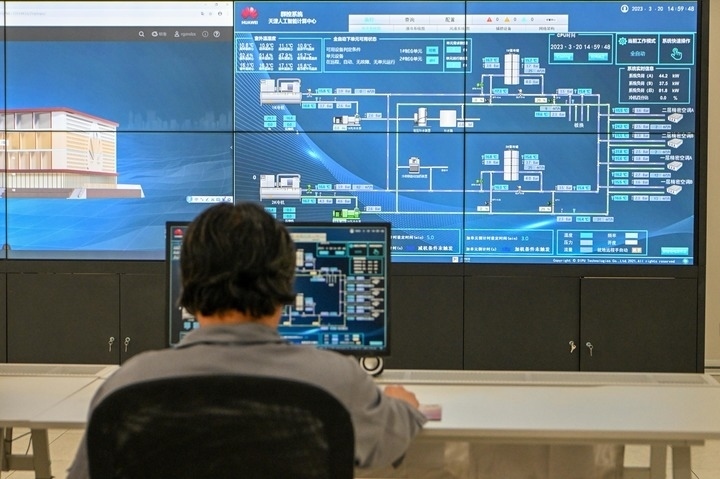 在天津市人工智能計算中心中控室,技術(shù)人員在監(jiān)控設(shè)備運行情況。新華社記者 孫凡越 攝